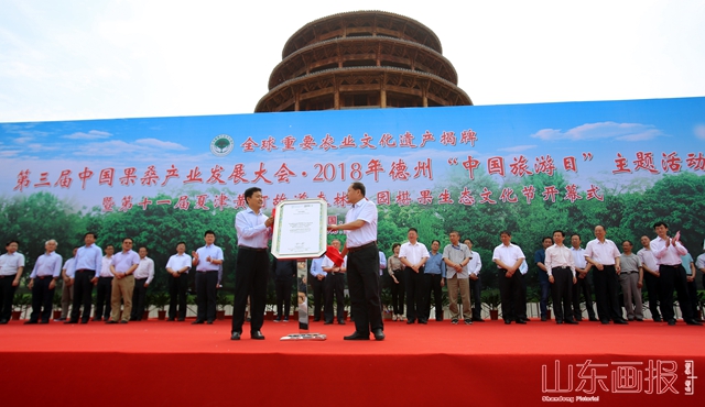 山东省农业厅副厅长褚瑞云同志与夏津县县委书记才玉璞同志为“夏津黄河故道古桑树群”全球重要农业文化遗产揭牌