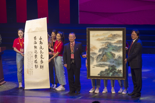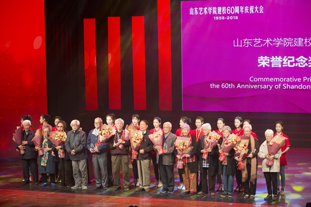 山东艺术学院党委书记马东骅、院长王力克为学校80岁以上的老教师、老职工代表颁发“山东艺术学院建校60周年荣誉纪念奖”,学生代表向获奖教职工代表献花。