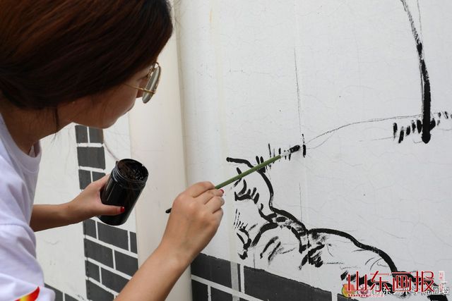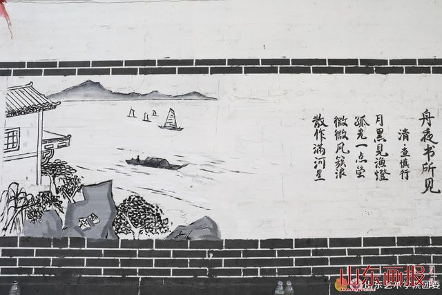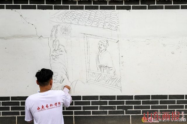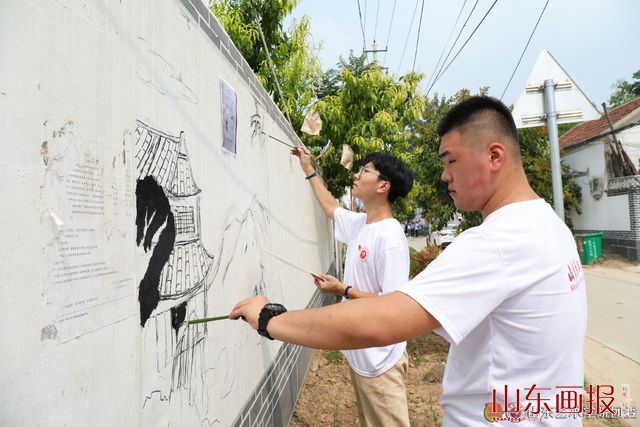 36名实践团成员在酒店张庄村,利用两天时间,分成十几个小组在总长度400多米的墙面上构思起一幅幅中国古诗古韵的图景,用手中的画笔尽情描绘着中华民族精粹的文化场景。从准备画材到分组测量和勾线,从打底色到涂颜料,实践队员们把每一面墙体都当成了艺术品去雕琢,大家就调色、构图进行热烈的讨论,精益求精。经过同学们的精心设计、认真创作,以古诗词和中国传统水墨画为题材的图景让一面面光秃秃的墙体“脱胎换骨”,生动起来,让整条街道更加美丽。
