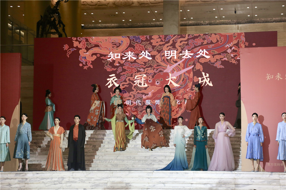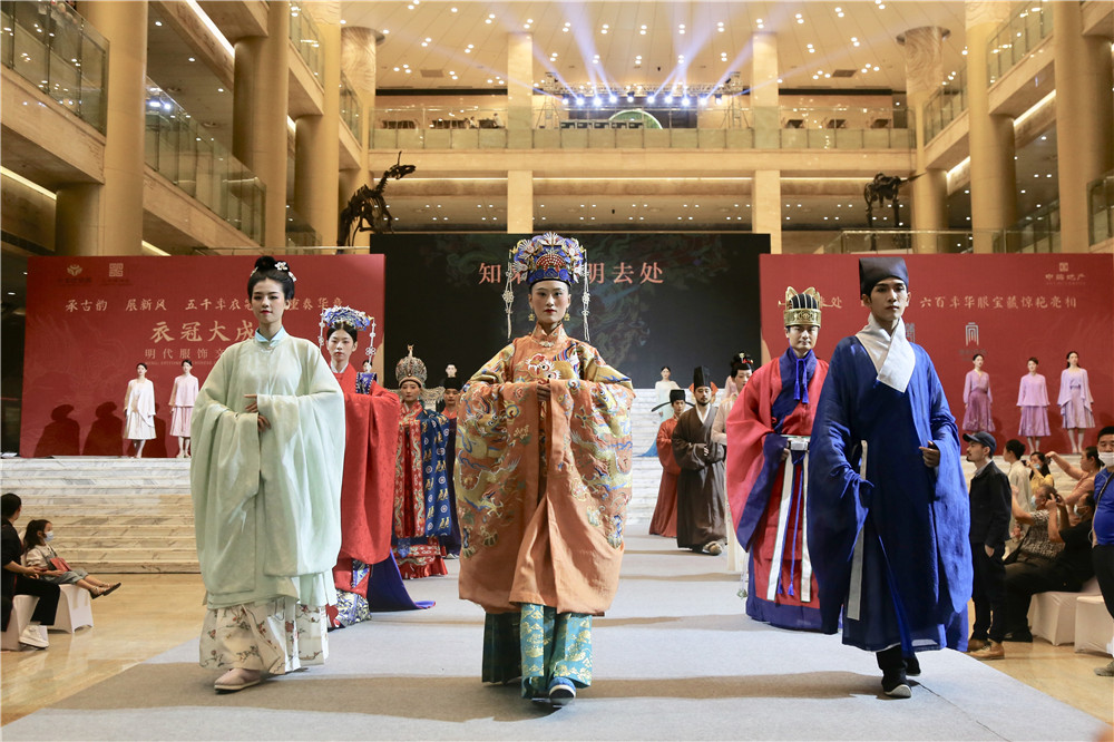 本次展览由“垂衣天下治”“华锦庆嘉时”“香霭入长裾”三个单元构成,分别展示了明代官员服饰、嘉礼服饰和日常起居服饰,从礼仪文化、织绣技术、服饰多样化发展等角度表现了明代服饰的风采与魅力。展览中还设计有中华传统服饰创新延伸环节,结合当下流行的中国色、创新面料、工艺等服饰美学方面的设计作品,呈现了独特的“展中展”,让观众真正体会到传统服饰文化在当下的“活化与应用”。
