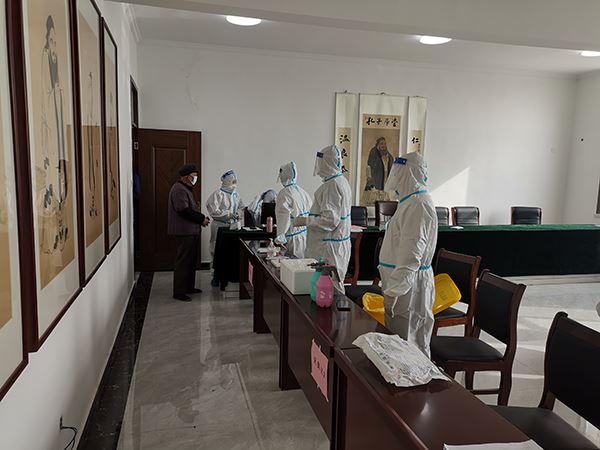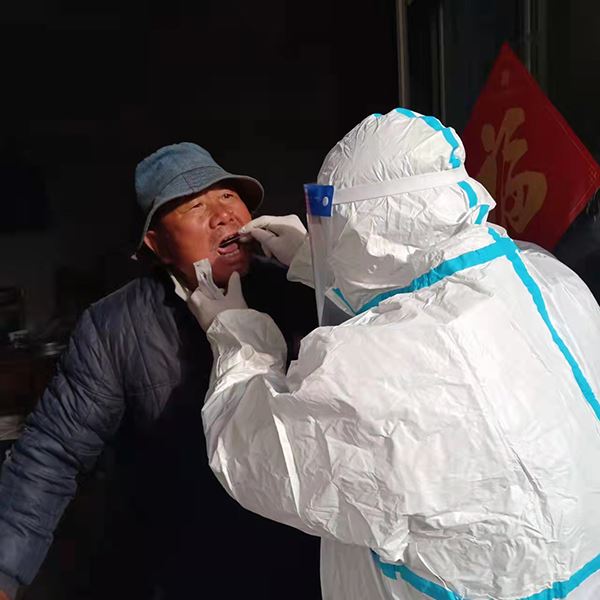 身穿防护服的医护人员入户为行动不便老人进行核酸检测采样