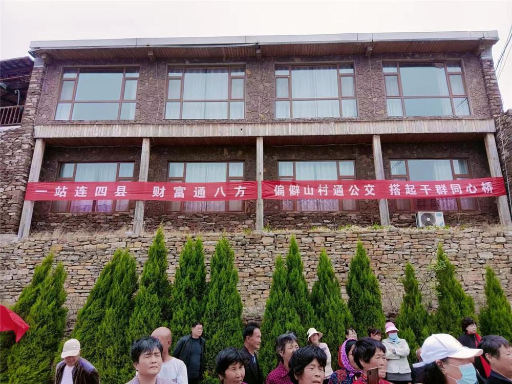 广场东面墙上的一条横幅更是特别的显眼:一站连四县,财富通八方。偏僻山村通公交,搭起干群同心桥。